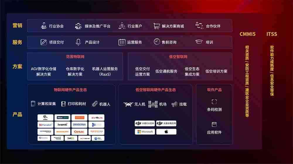 聚合国内外先进的物联网硬件产品品牌,,,聚焦数字化仓储、、、、机器人运营、、、低空智联网等领域,,共同打造适合客户业务场景的解决方案并提供交付服务